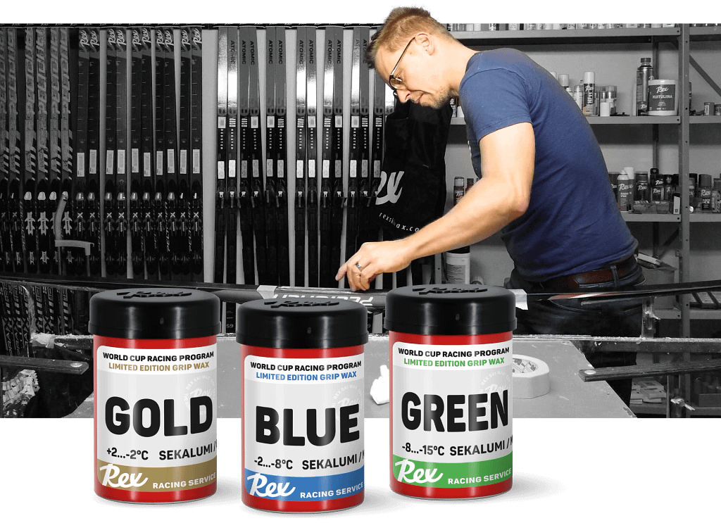 Based on this philosophy, we designed three new kick waxes to complement the Rex Racing Service line: Gold, Blue, and Green.”