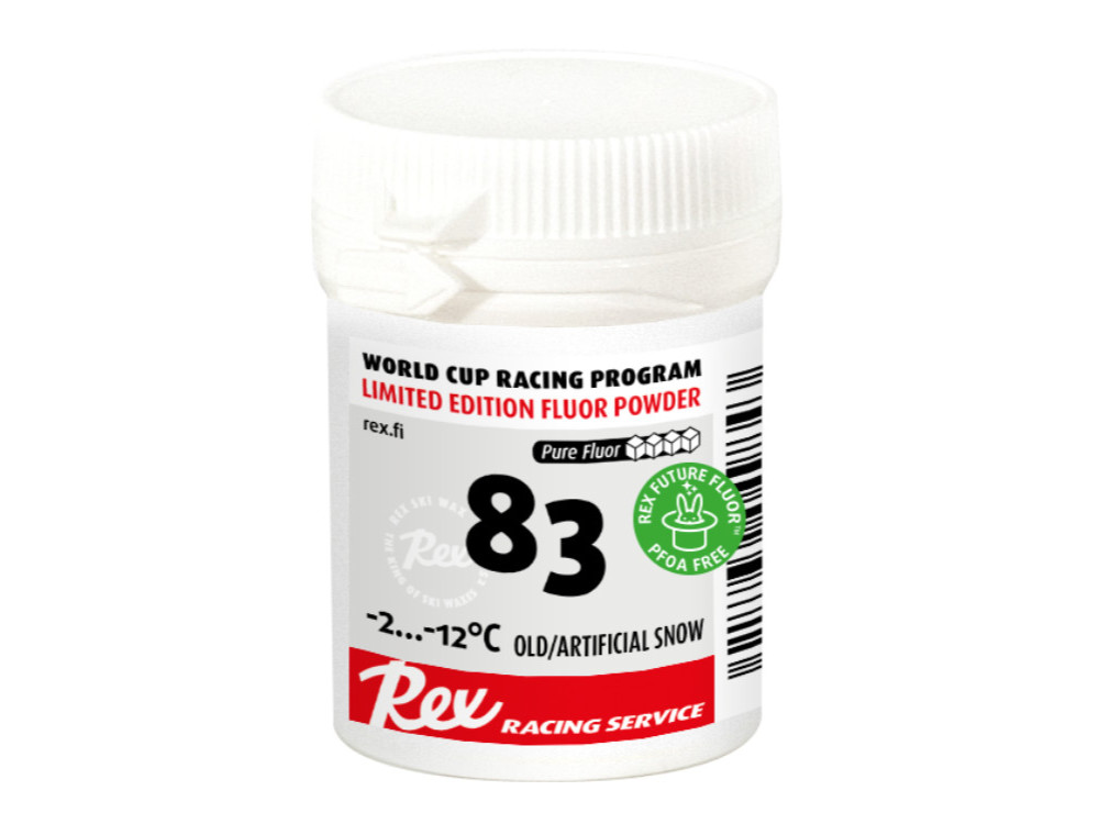 83-pulveri päihitti 77-pulverin Lahden MM-kisojen testeissä kun Salpausselän tuore pakkaslumi alkoi muuttua vanhemmaksi. Yhdessä parivaljakko 77 & 83 dominoi Lahden 2017 pulveritestejä. Sisältää grafiittia. Kaudelle 20/21 päivitetty Rex Future Fluor -versio.