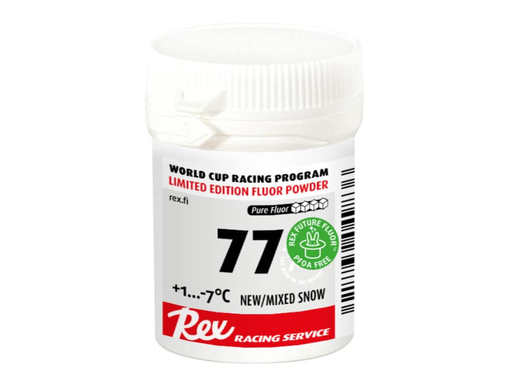 77-uutuuspulveri oli Lahden MM-kisojen pakkaspäivinä ylivertainen kun lumi oli uutta ja kuivahkoa (D:27), ja lumen lämpötila oli -5,5°C. 77-pulveri oli MM-kisoja edeltäneen intensiivisen testiohjelman tulos. Täysin uudet raaka-aineet. Ei sisällä grafiittia eikä molybdeeniä. Kaudelle 20/21 uusi Rex Future Fluor -versio.