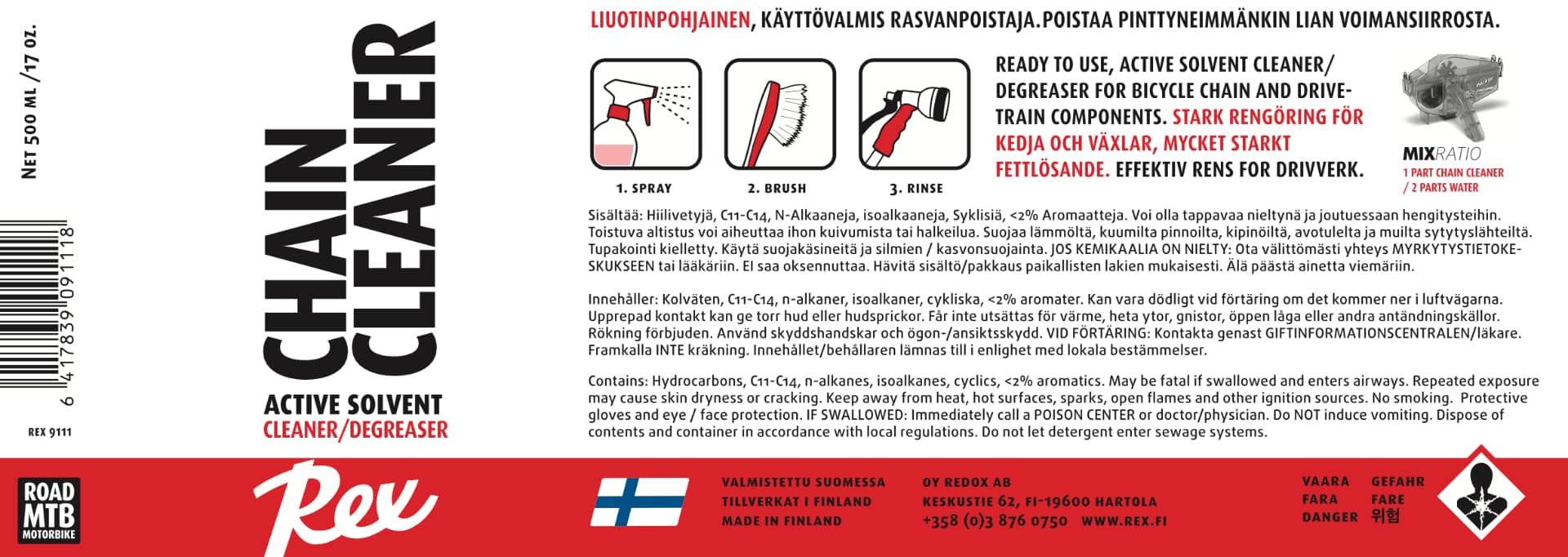 Rex Chain Cleaner -tehopesuaineessa käytetyt pinta-aktiiviset aineet parantavat matala-aromaattisen hiilivetyseoksen pesutehoa, ja mahdollistavat sen tilapäisen sekoittumisen veden kanssa. Rex Chain Cleaner irroittaa pinttyneimmätkin öljy- ja rasvajäämät. Rexin punainen pesuaine voimansiirrolle, vihreä Bicycle Wash kaikelle muulle!